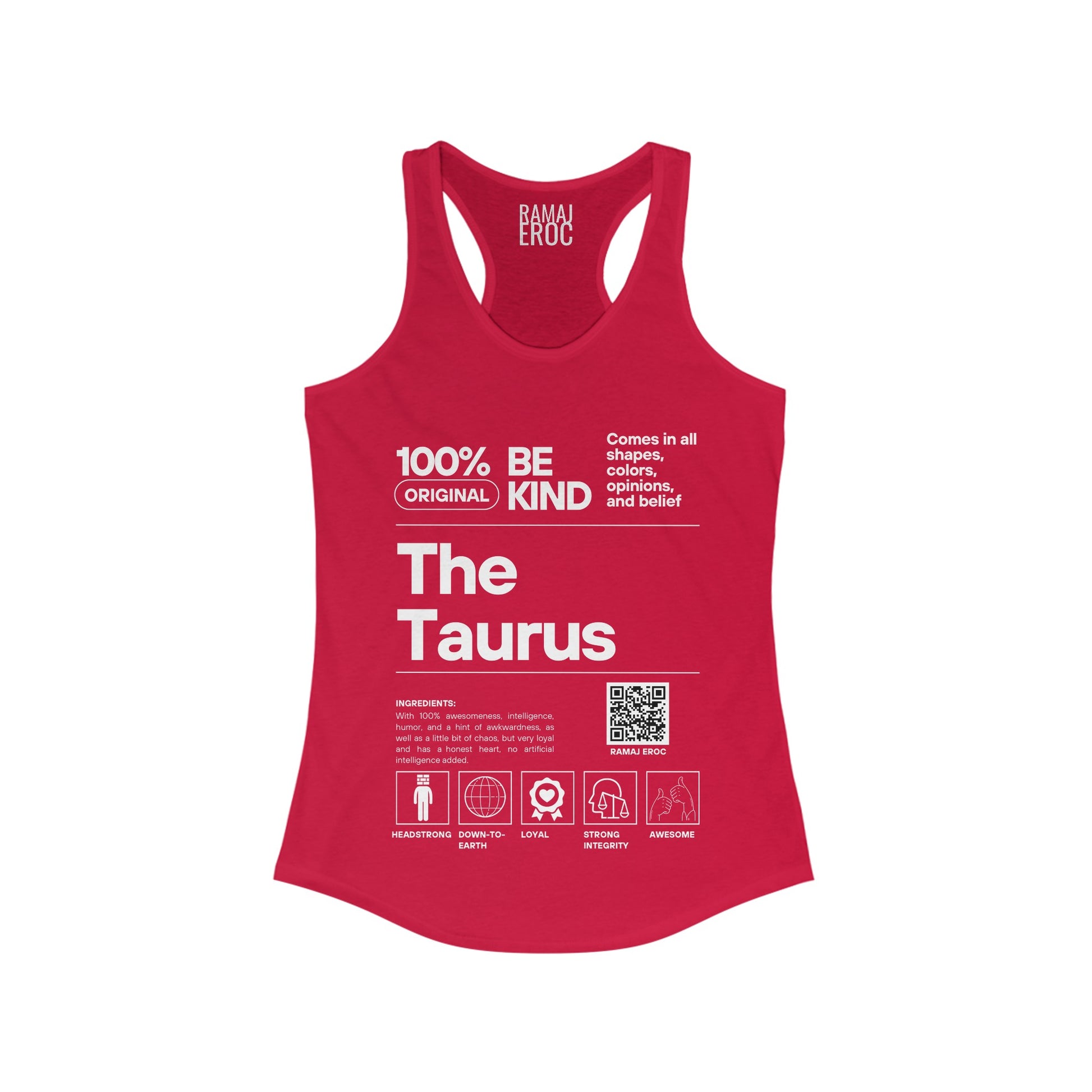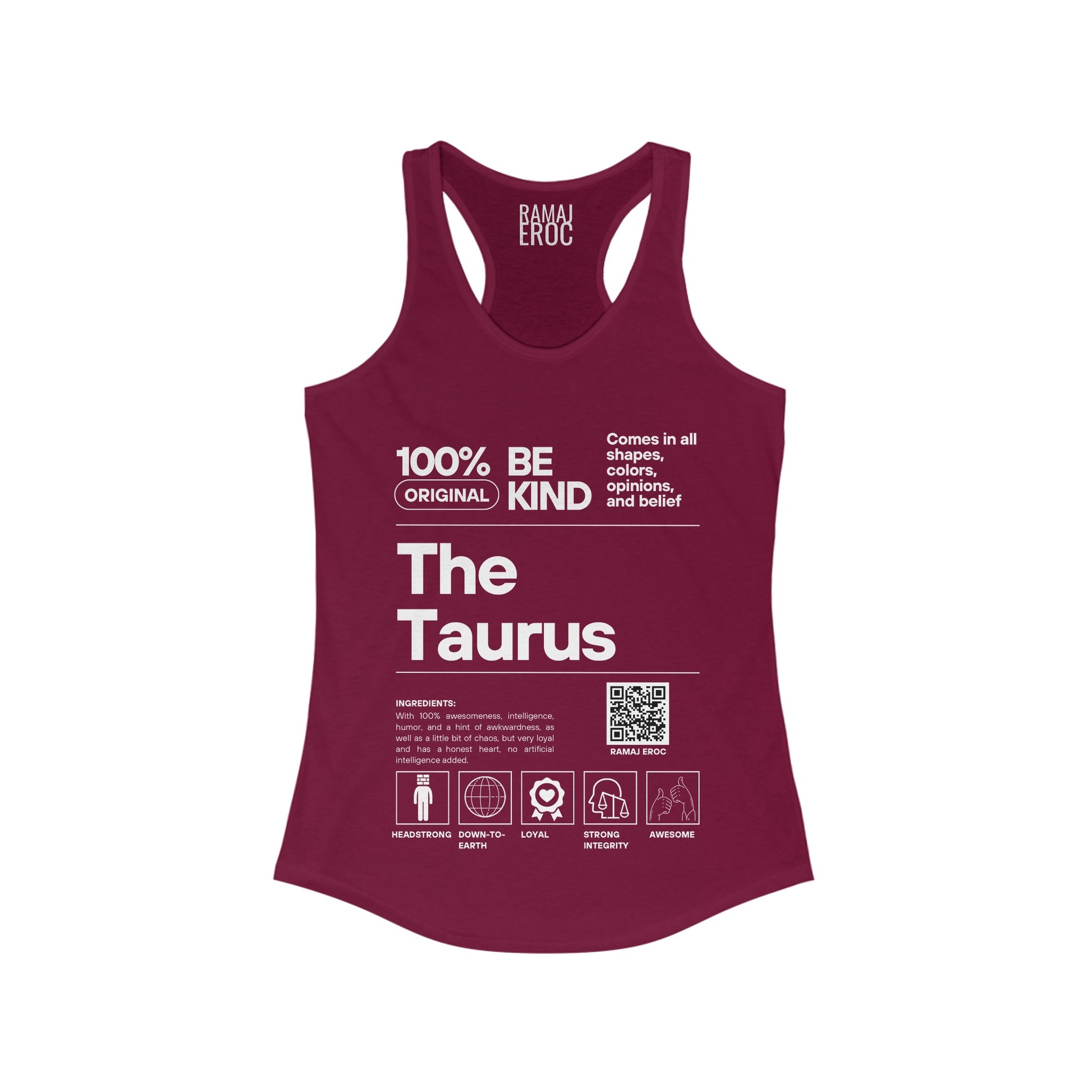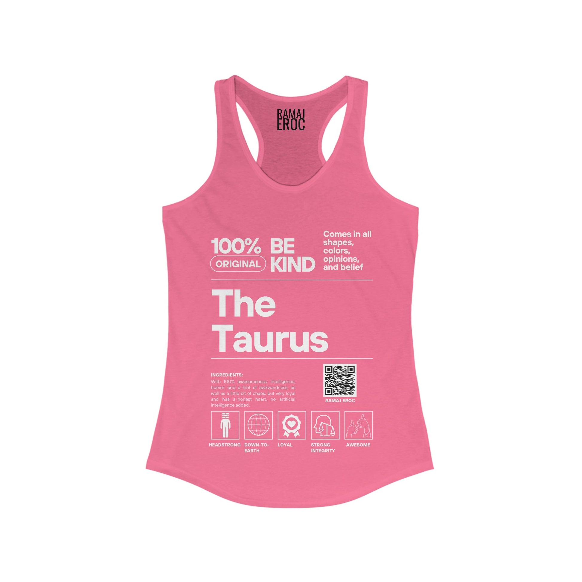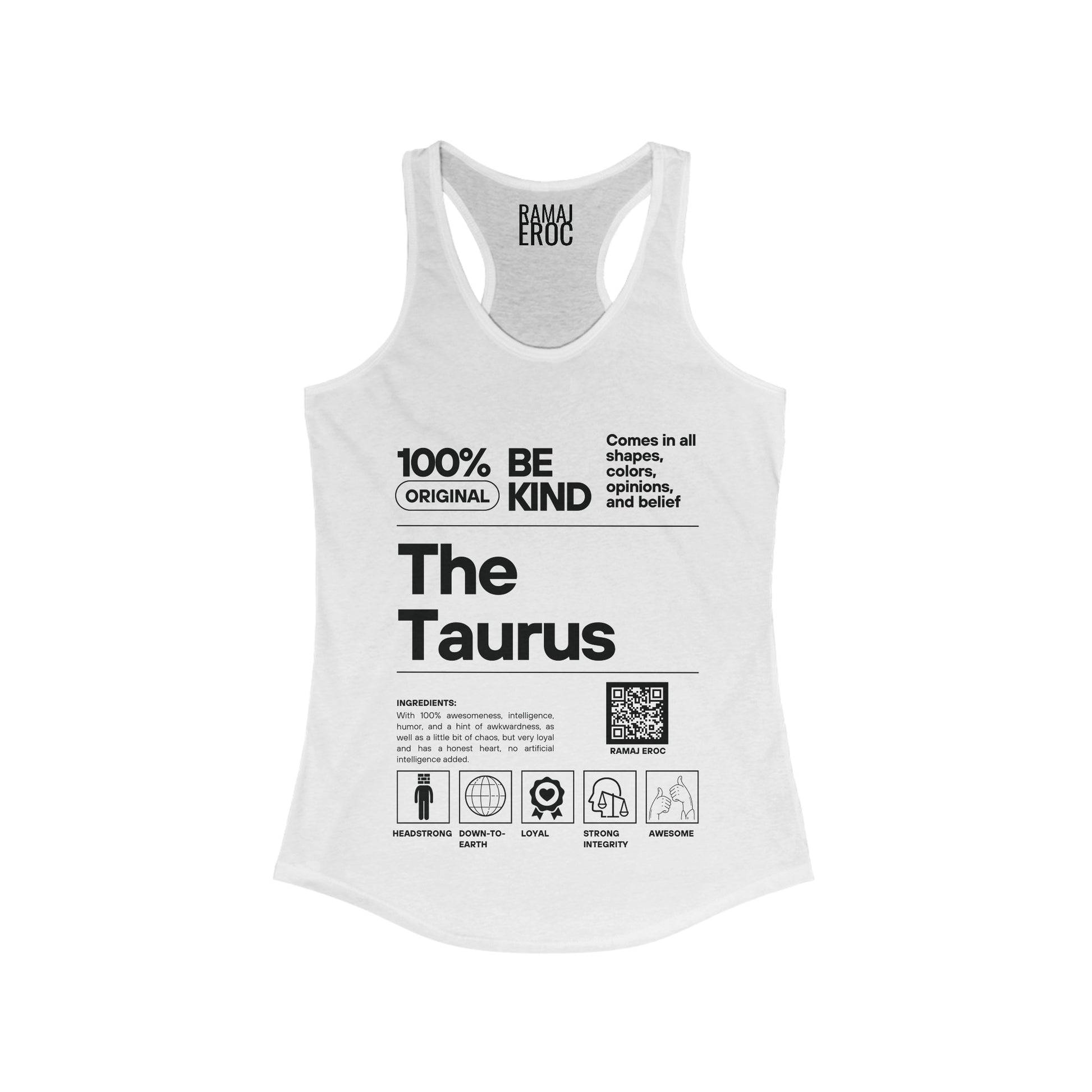 WOMEN'S IDEAL RACEBACK TANK WITH ARTWORK INSPIRED BY RAMAJ EROC'S SINGLE "TAURUS SZN" PRINTED ON FRONT.